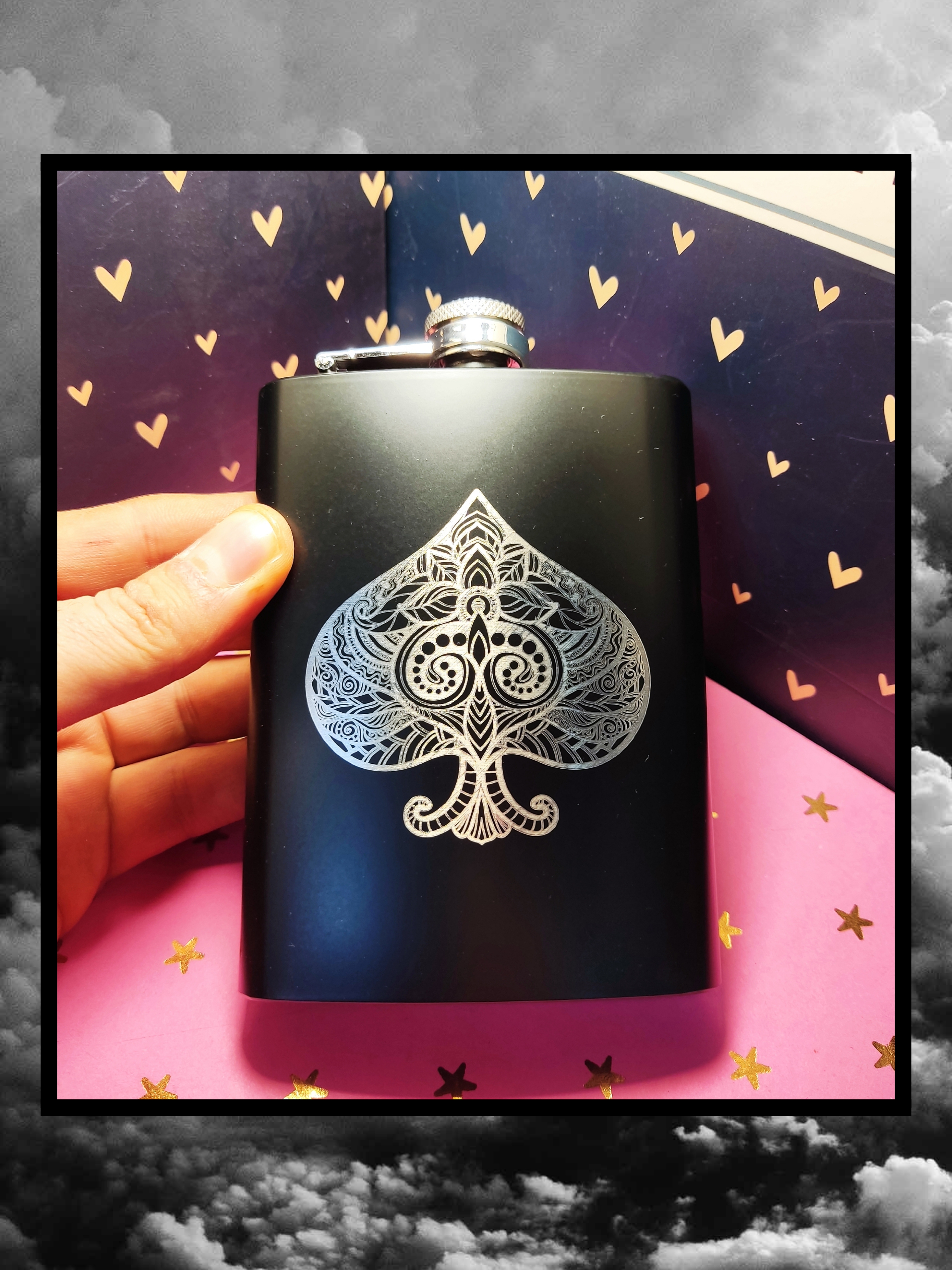 در مورد بطری: بطری استیل جیبی است و در پیچی محکم دارد طرح روی آن اسپیک میباشد