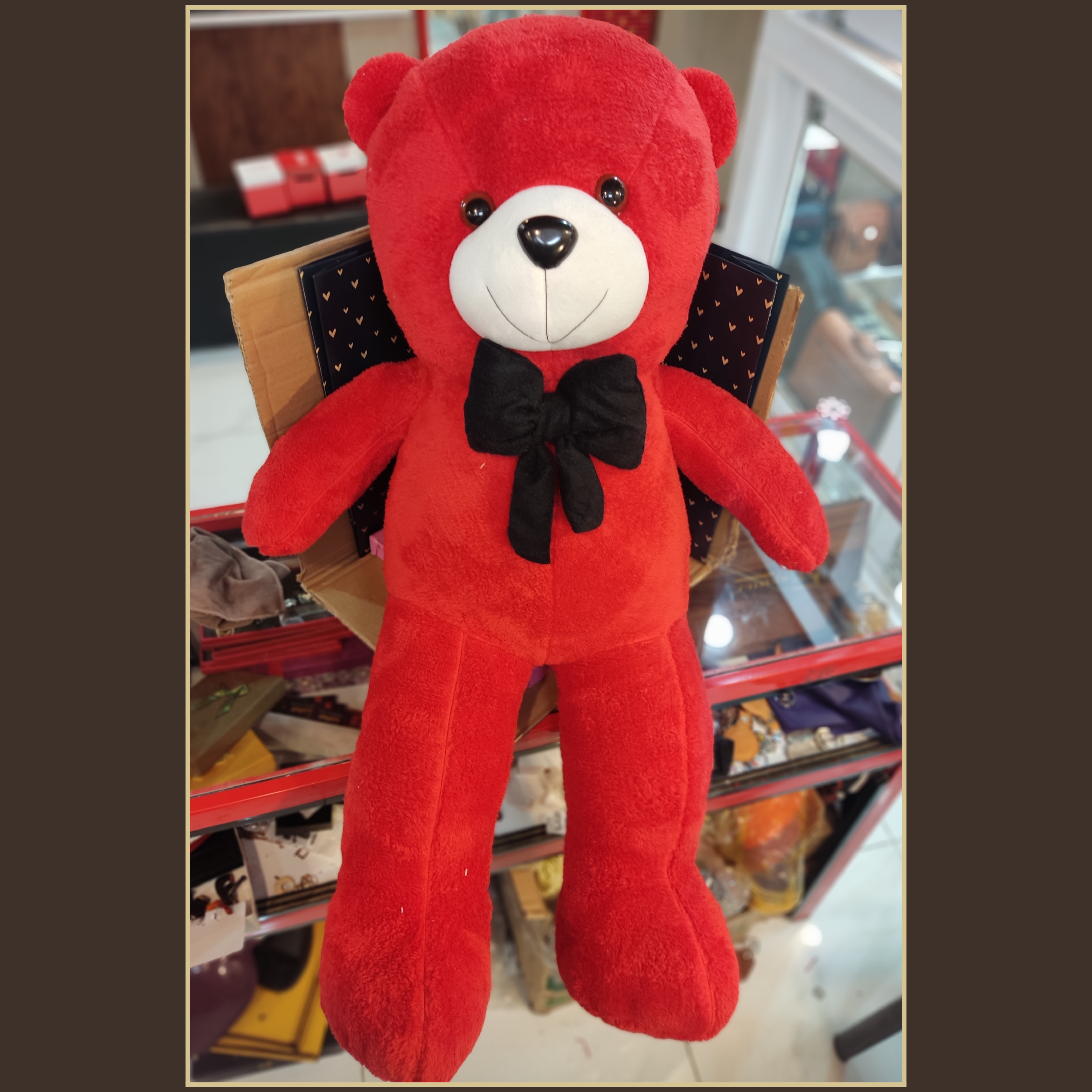 اندازه یک متر و رنگ خرس قرمز و پاپیون آن مشکی میباشد