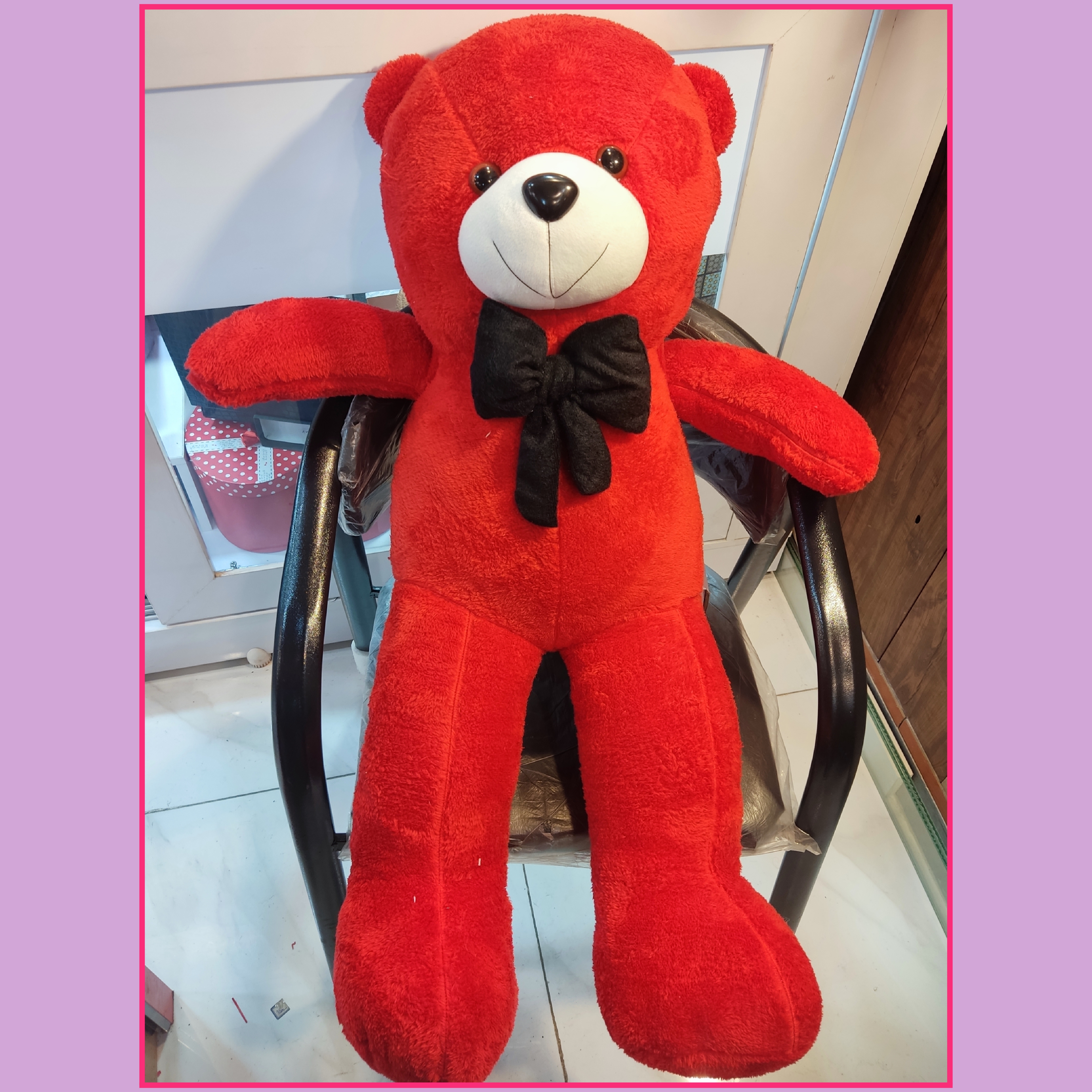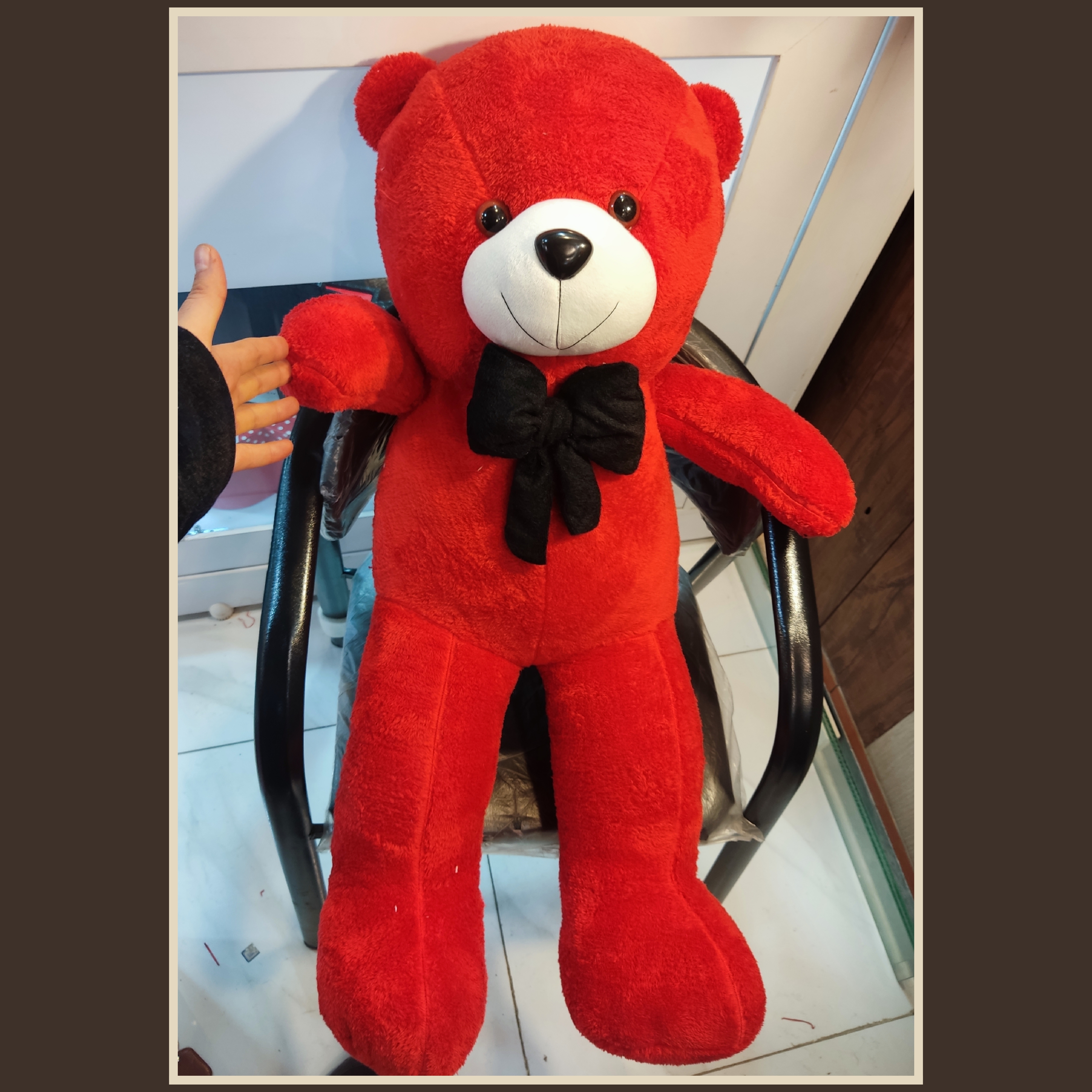 اندازه و رنگ: اندازه یک متر و رنگ خرس قرمز و پاپیون آن مشکی میباشد