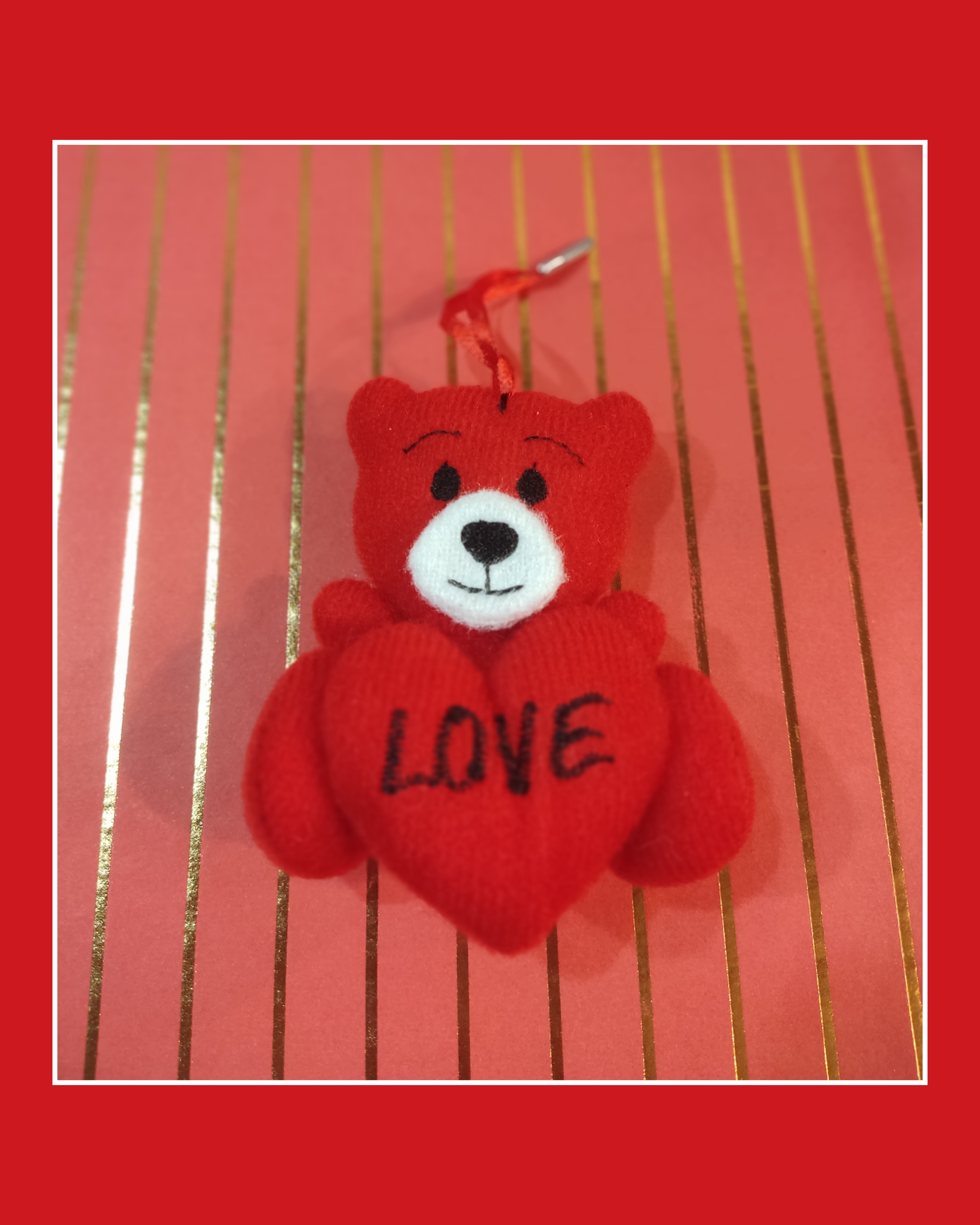 با چهار عدد عروسک کوچیک خرس love که آویز کوله نیز میباشد و پوشال قرمز تزئین شده است