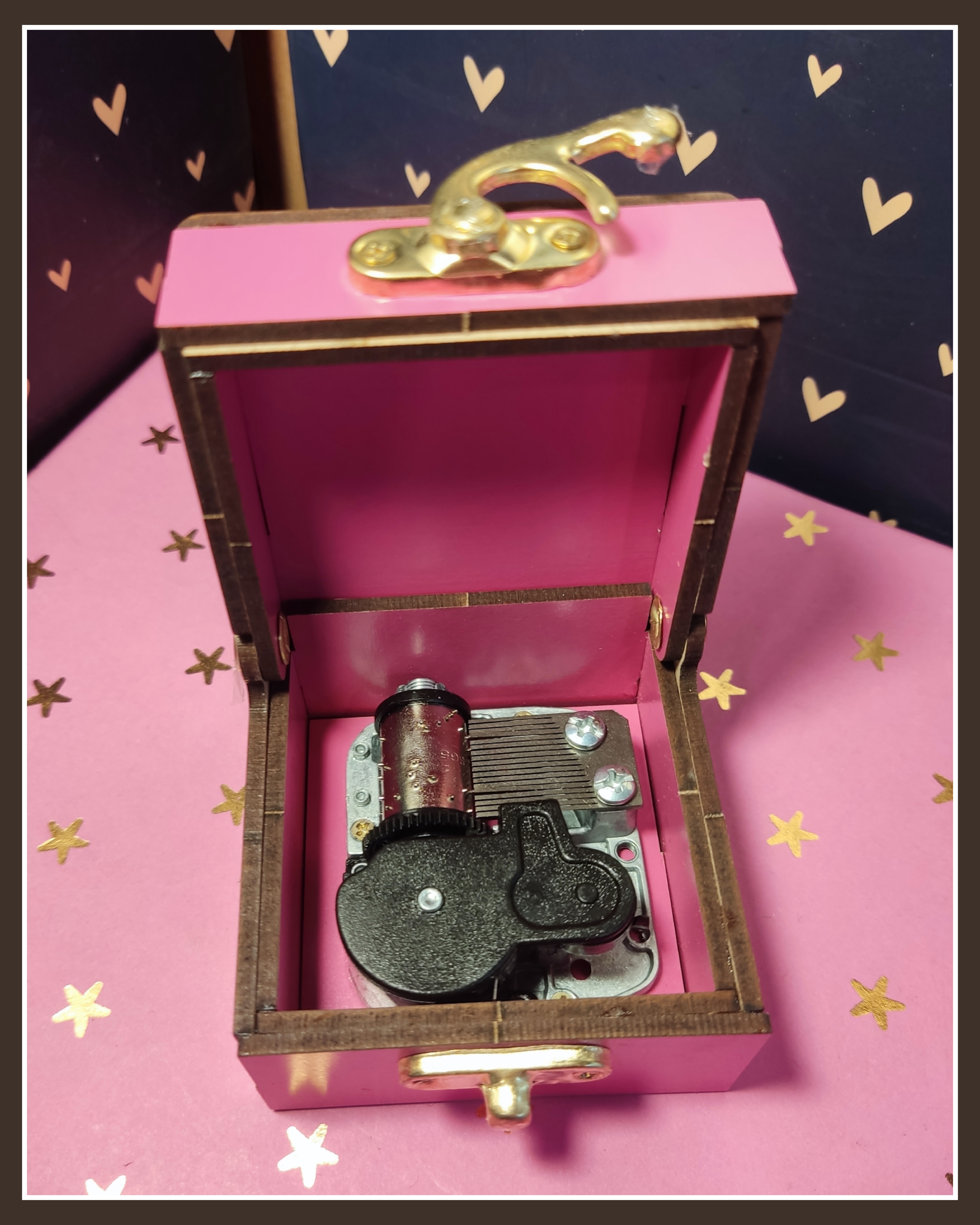 جنس بدنه آن از جنس چوب و داخل جعبه پر از چرخ دنده موزیکال کوکی میباشد