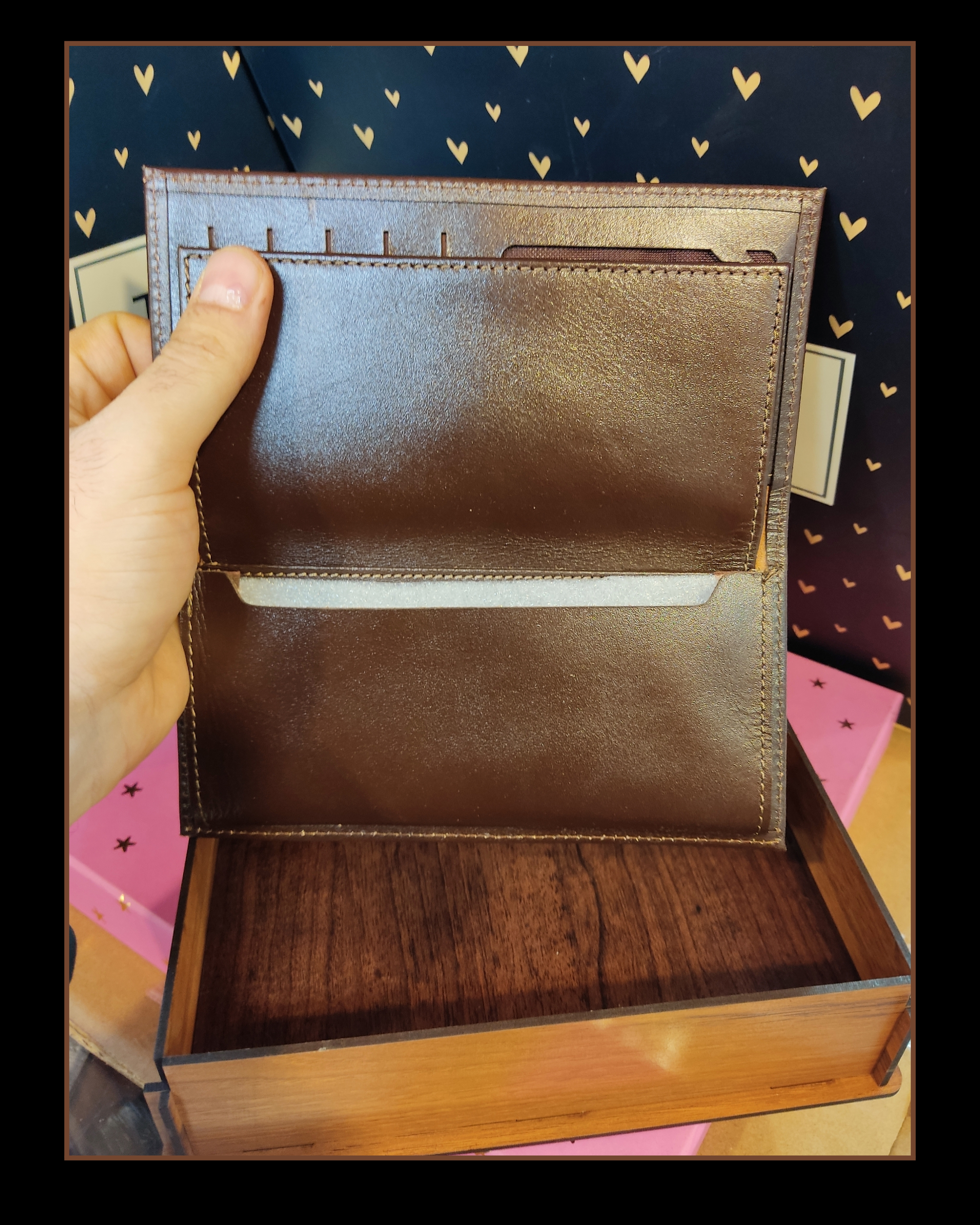 جای موبایل و مدارک زیادی درون آن تعبیه شده و همچنین جای کارت زیاد دارد