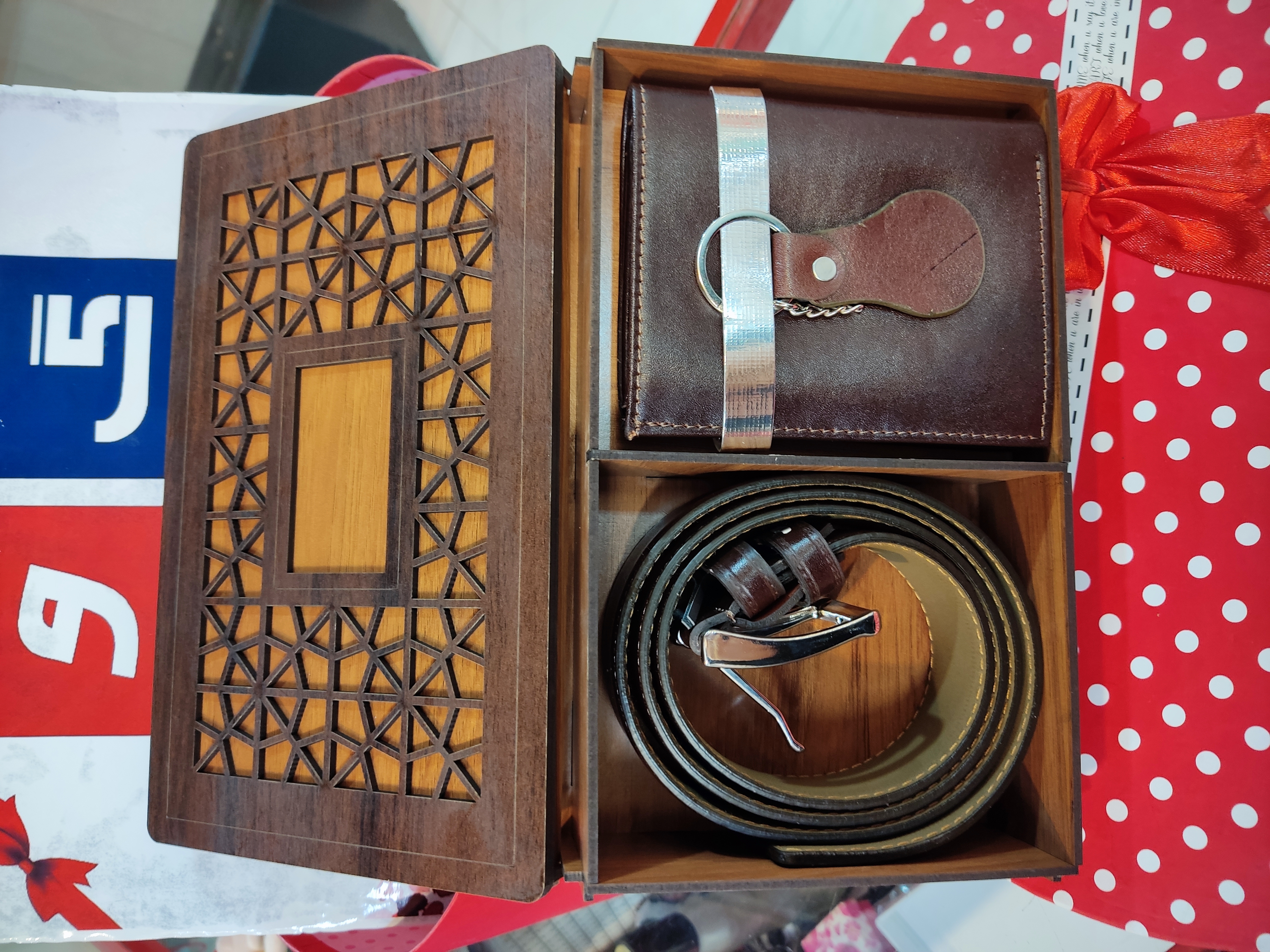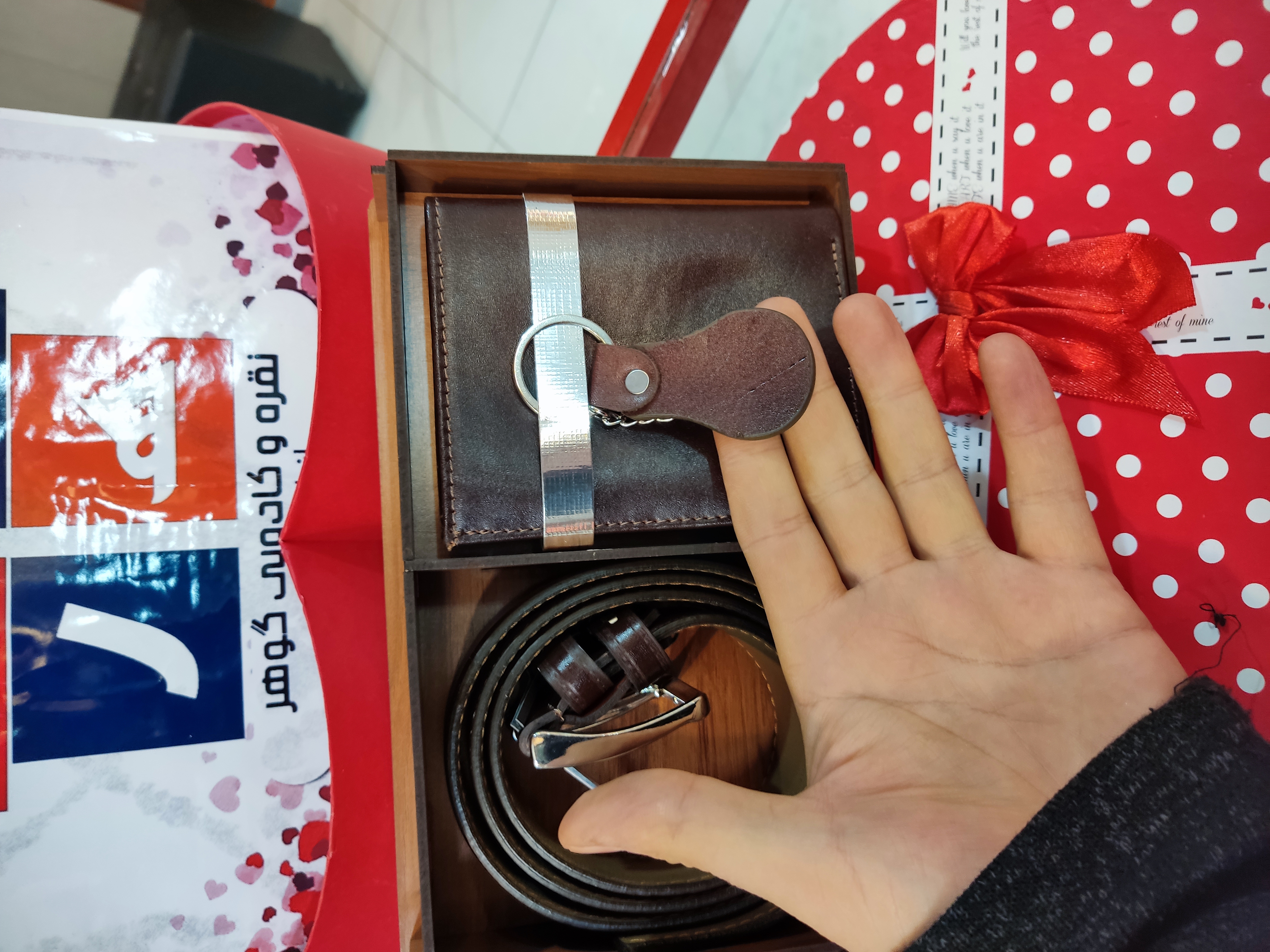 ویژگی: همه اقلام چرم درجه یک هستند همراه جعبه چوبی زیبا و محکم